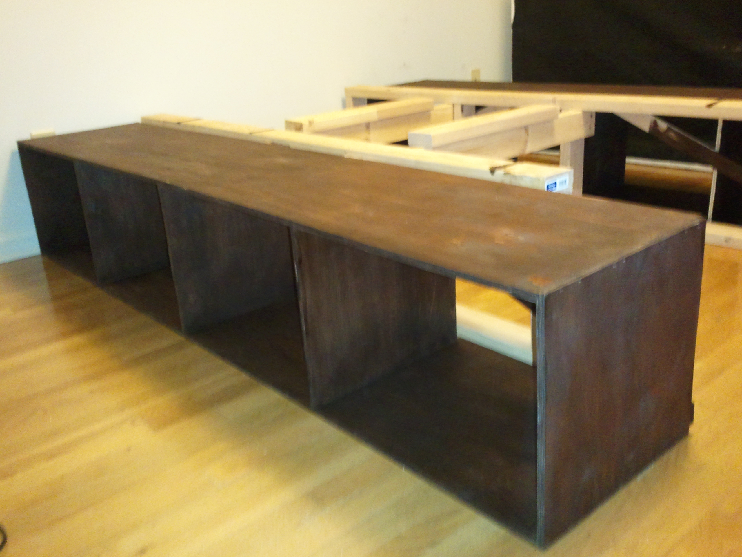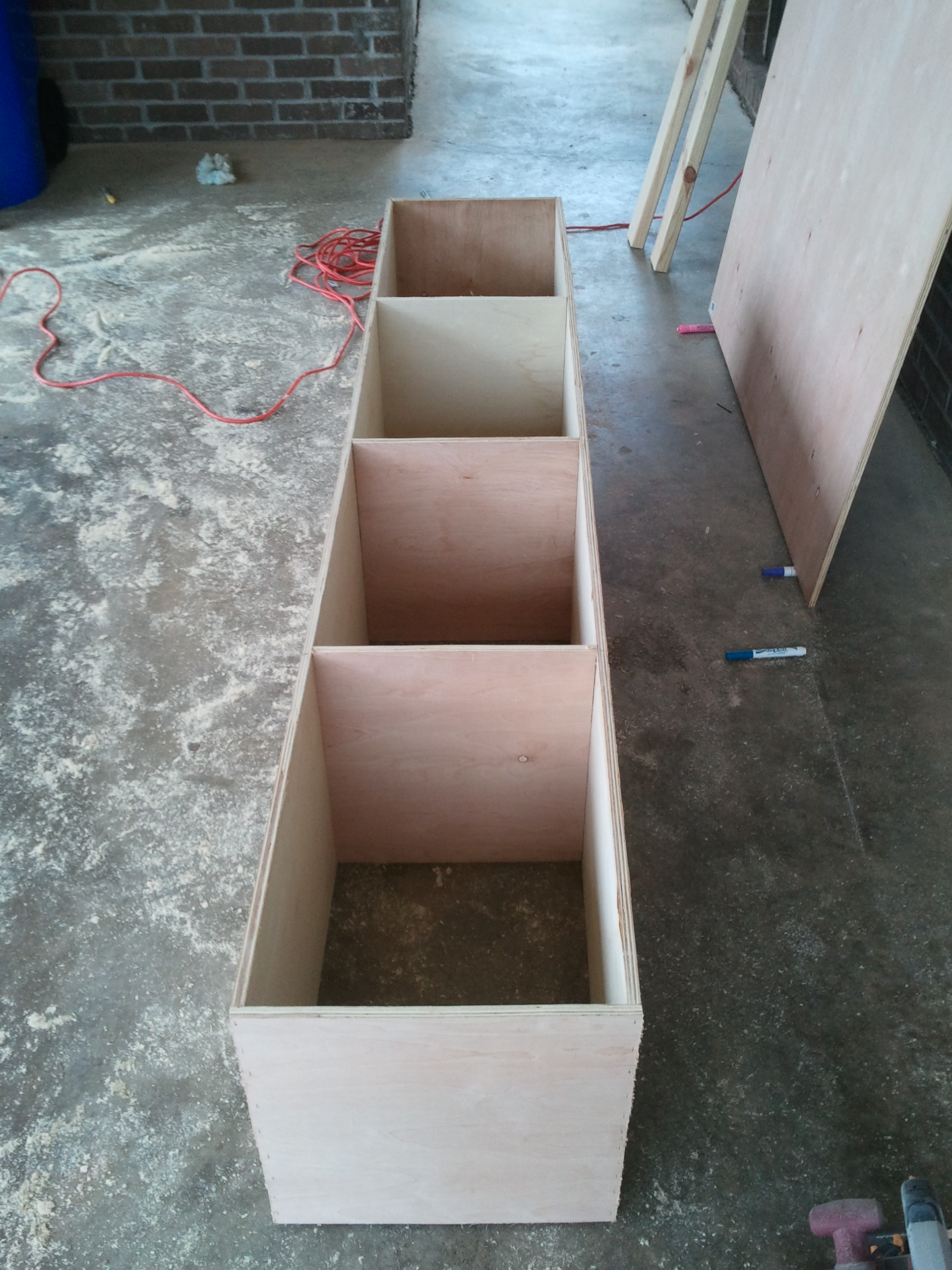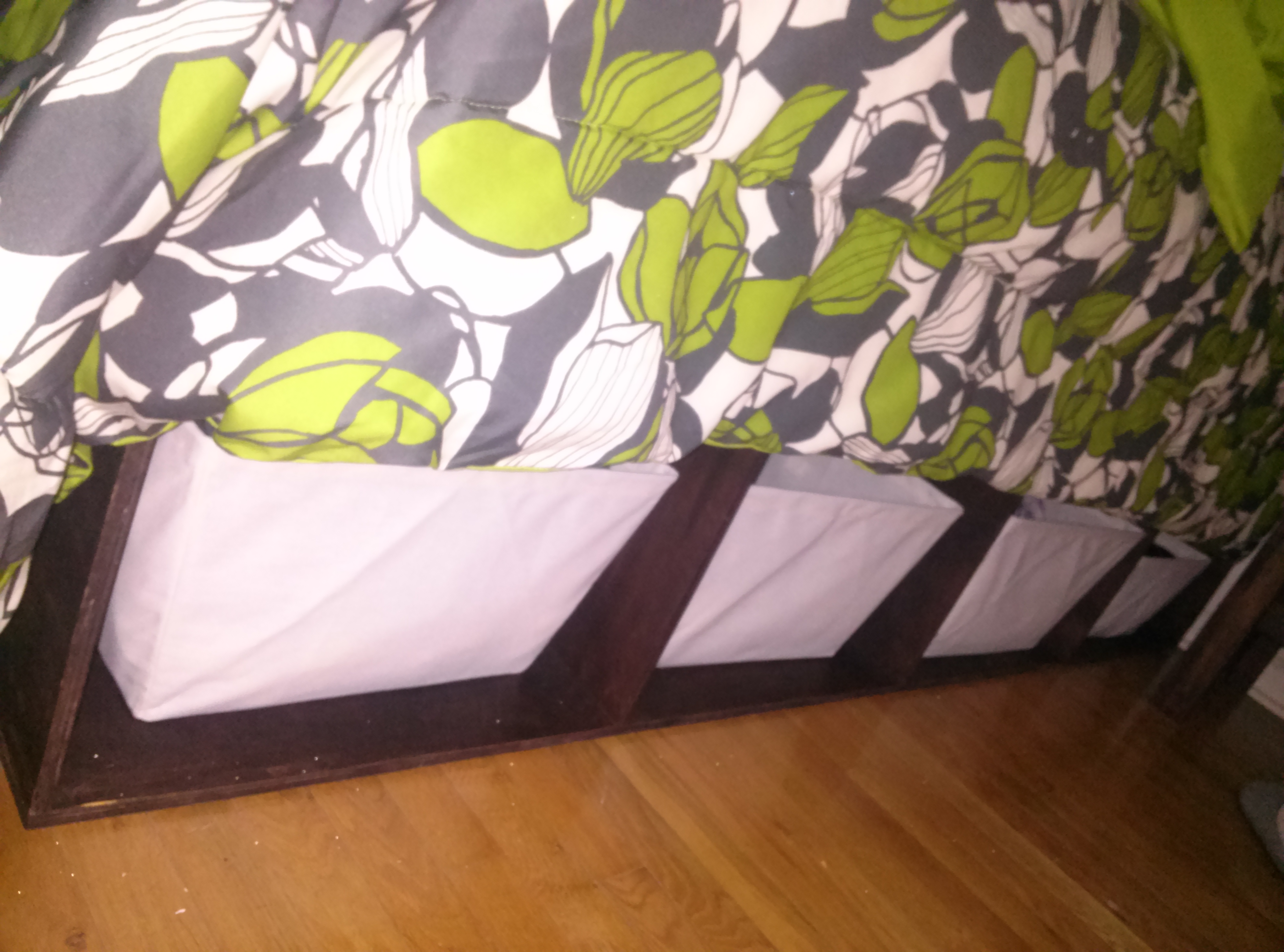 It was an easy design since you just make the boxes with two long pieces for the length of the bed and 5 short pieces for the height you want and to sanction off the cubbies. You can make more cubbyholes by just putting in more short pieces. Also when you are determining the height make sure you take into account how big the baskets are and how big your box springs and mattress are. We used some nicer plywood for these. This is where most of the cost went.