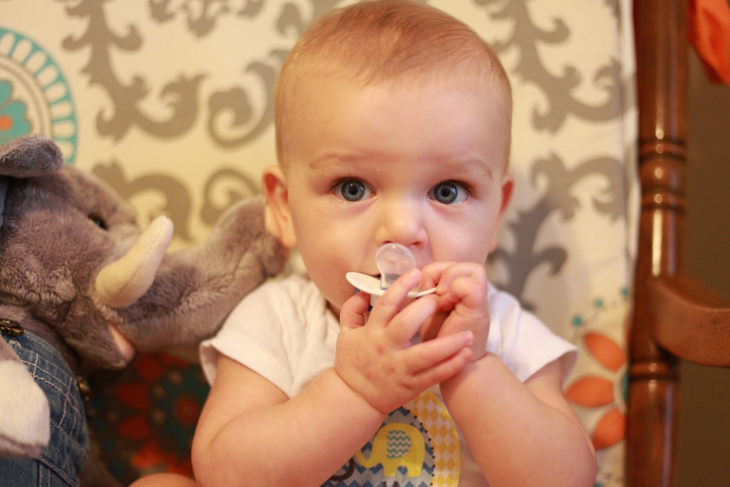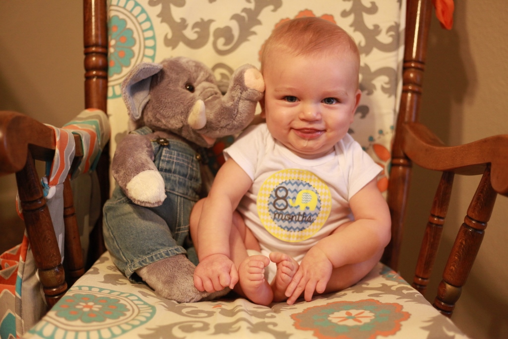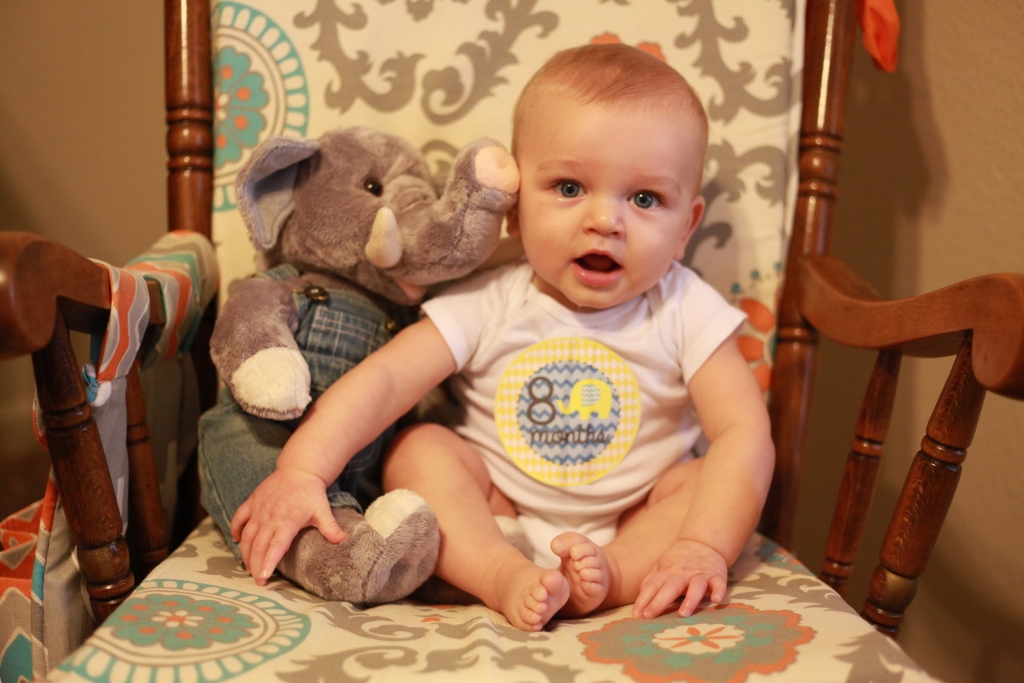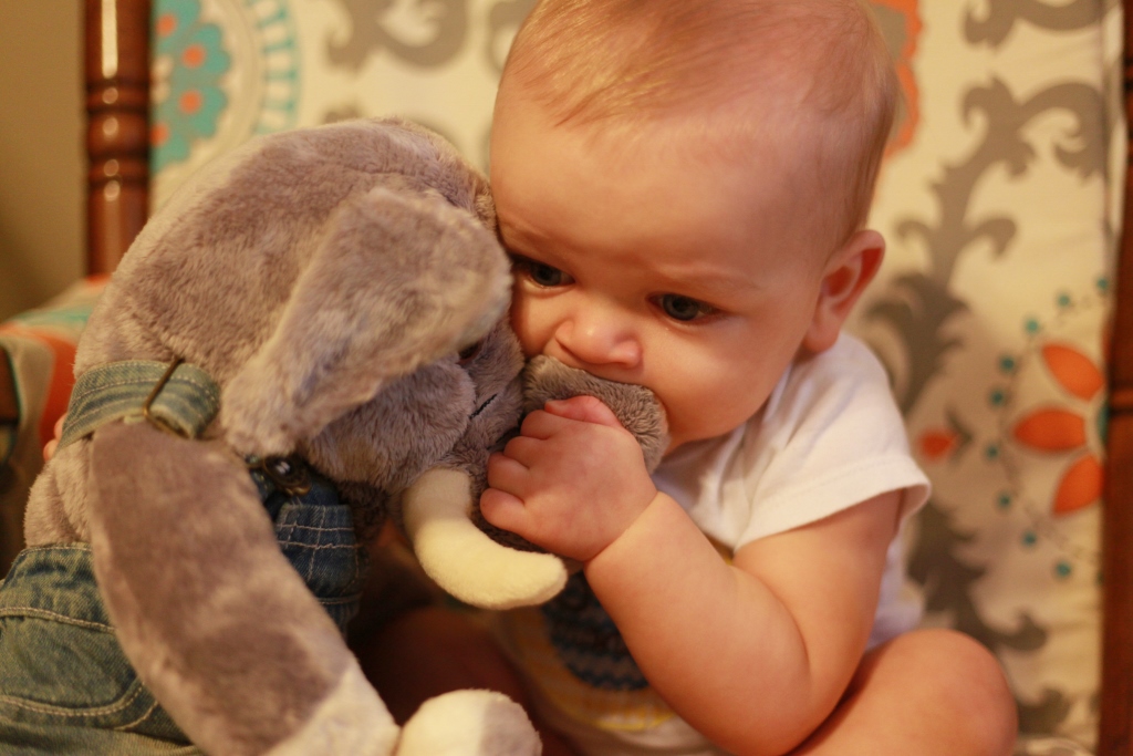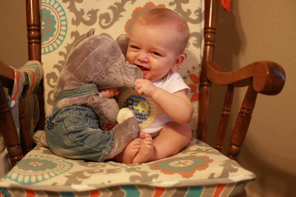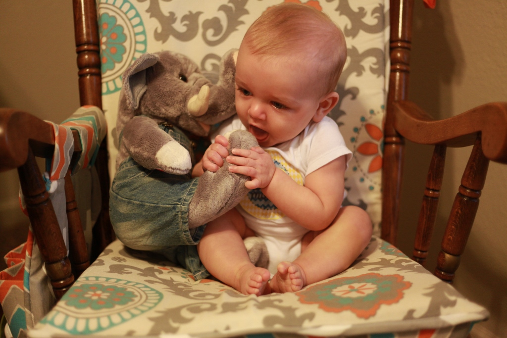 Sleeping:  We have had sleep patterns all over the place. We will have days where he will sleep through the night no problem in his crib. Then other nights he wakes up every two hours and then ends up co-sleeping in our bed because it is the only way to console him. Sometimes though just putting the pacy back in his mouth and giving him his elephant will be enough to lure him back to sleep. We have been doing better at getting him to nap once in the morning and once in the afternoon. He goes to bed at 7:30pm and then we wake him up at 10 for another bottle to help him get through the night. Both of these times it is pretty easy to get him to sleep by a little rocking and my lovely rendition of the “Star Spangled Banner.” Tom is successful getting him to sleep by just rocking him for seriously a minute or two and then putting him in the crib wide awake. I have to have him half-asleep before I put him down, so my rocking takes a little longer. He does sleep with a pacy and a stuffed elephant now. If you pull the elephants tail it sings a lullaby so that is one of our go-to distractions to get out of the room while he is still awake.