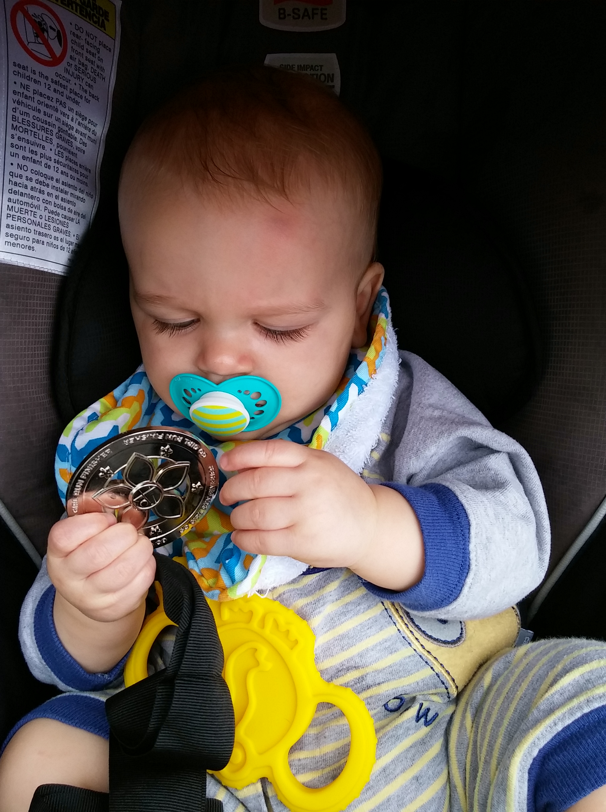 Last minute, I decided to run to the car and assemble the stroller together. Luckily I had the forethought to have the infant seat in my car just in case I decided to use the stroller so I could look at George throughout the race.