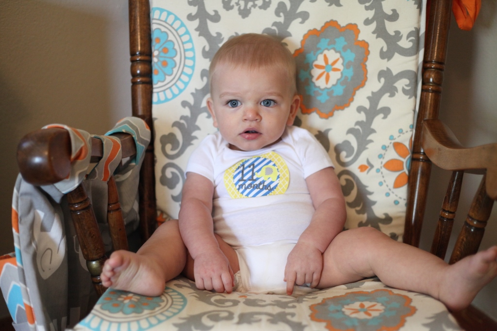 Diet: This kid can pack the food away. I don’t know how he is eating the quantity that he eats. It’s really astounding. We get him his own kid’s meal now when we eat out, and he eats the whole thing. He is still at only three (4-6oz) formula bottles a day (morning, before afternoon nap, and right before bed), but we will be cutting the mid-day one here soon. He has three traditional meals a day, and several snacks throughout. His favorite foods are blueberries, bananas, pasta, and oatmeal. We have fully transitioned him to a sippy cup. When we moved, I packed all the baby bottles up! Ironically too, we have seen a little less spit up with moving to the sippies, but there are still days that he throws the whole thing back up. He drinks water and apple juice occasionally throughout the day as well.