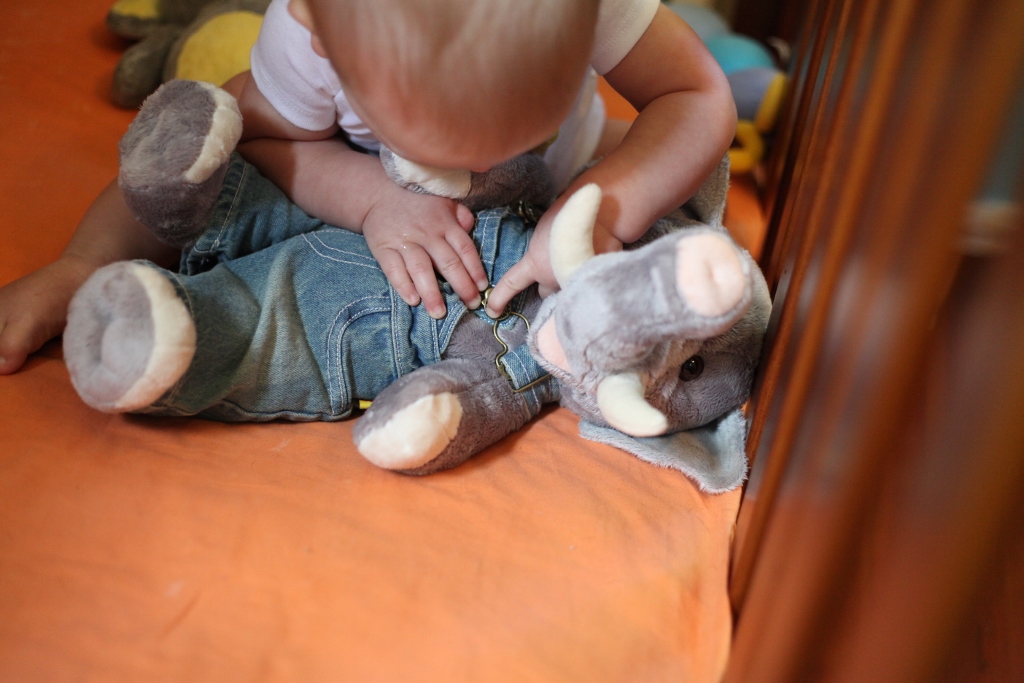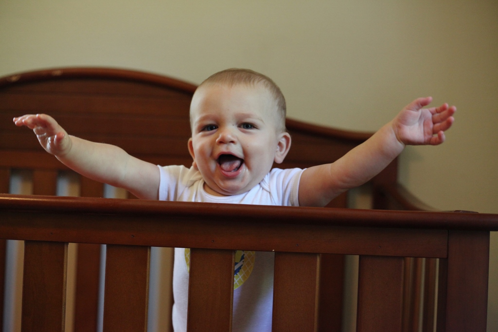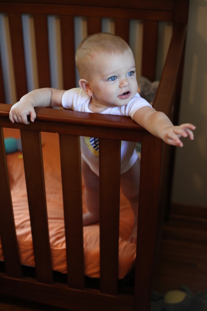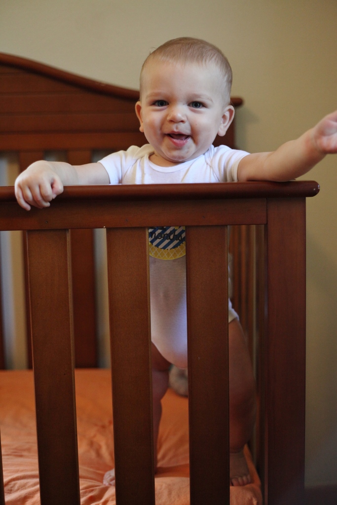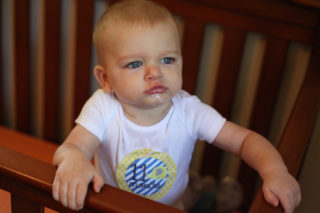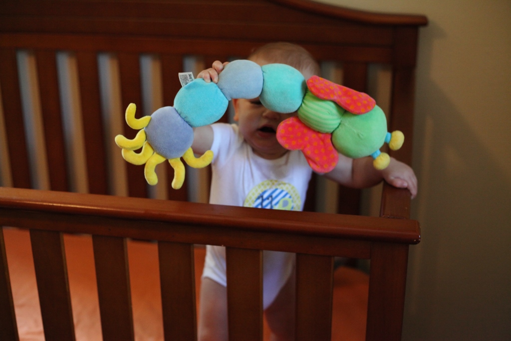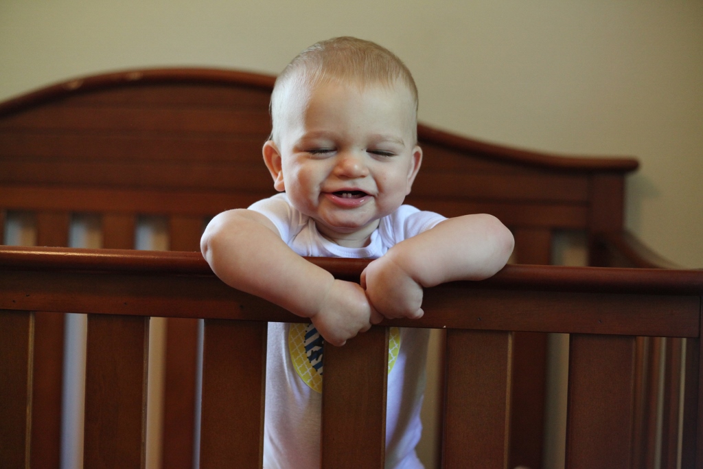 Sleeping: Sleep has been an anomaly this month. Teething is hard. We had one tooth break through this week, but there are three others you can see right under the surface, so poor thing has to be hurting. Naps have been hit or miss. He usually has one good nap a day, and the other one is kind of a crapshoot depending on the day. We have had to rock him to sleep a lot more this month, but even then he will scream like a bandshee when you first put him in his crib. He just doesn’t want to be alone. He also throws his stuffed animals out of the crib and then gets mad that he has nothing to snuggle with, so again screams his head off. For the most part, he is sleeping from 7:30/8pm until 5am, give or take some minutes. He has started scratching himself when he sleeps, so he always looks like he got attacked by a cat.