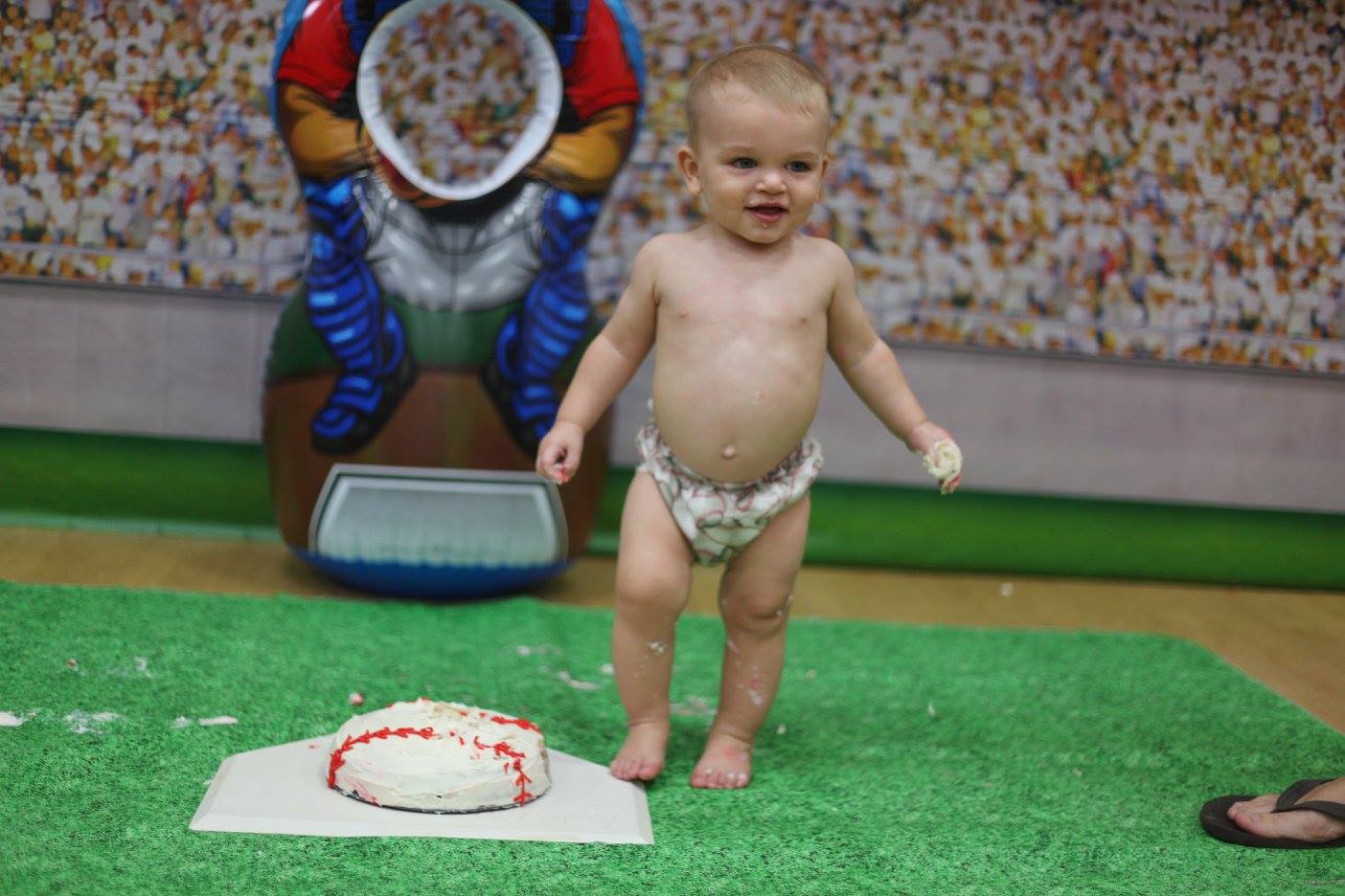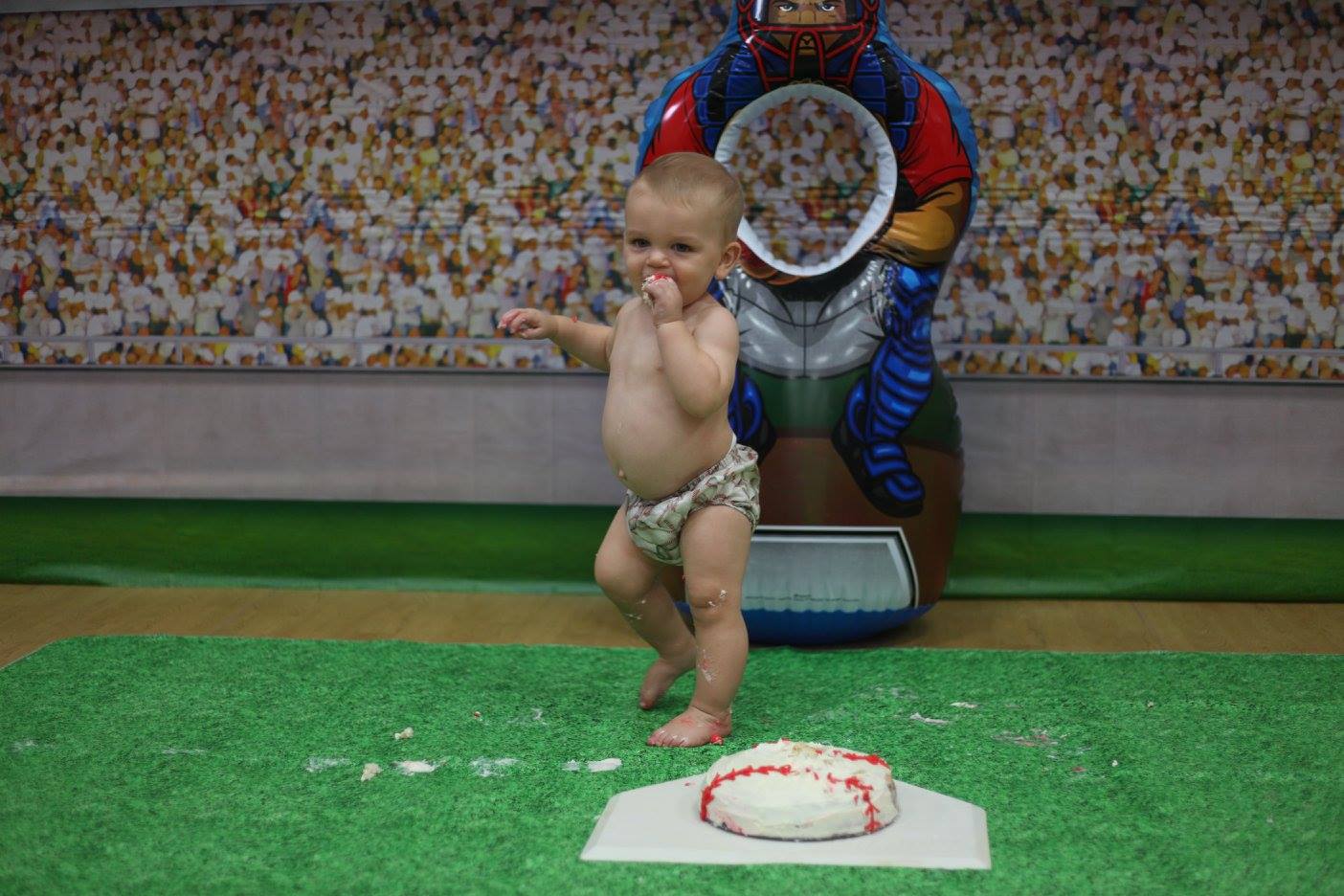 I found a picnic table cloth that looks like grass so we could do the cake smash on it easily instead of doing a high chair. My SIL got the idea to have a grandstand behind him once I told her about the grass. She found that wall hanging and the blow-up catcher on Zulily I believe.