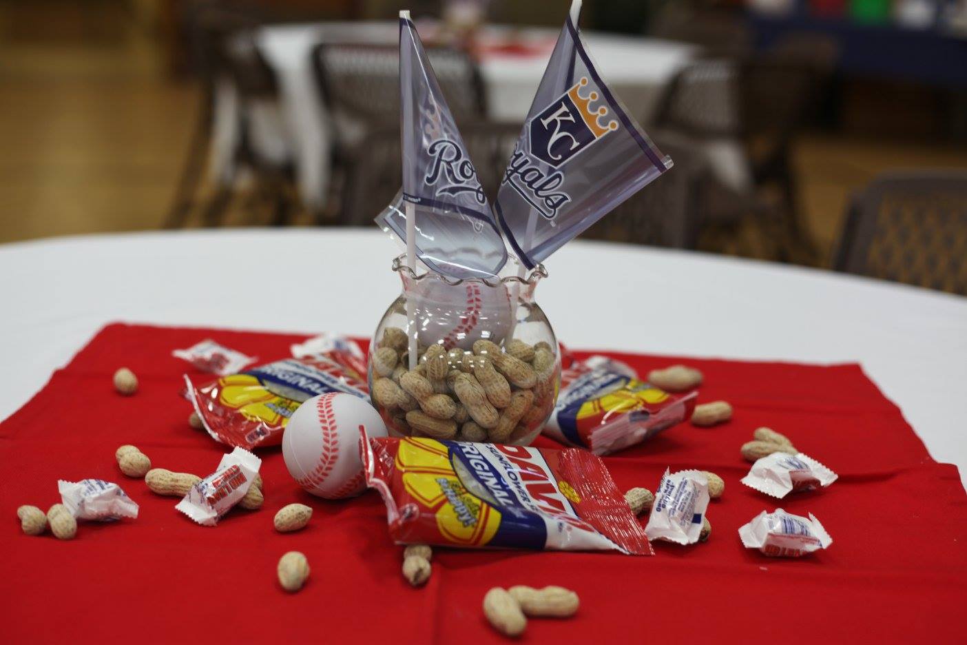 These were our centerpieces. I was able to get a pound of peanuts for $2 at our local grocery store. A pound goes a loooong way. Real baseballs were expensive, so I bought these stress balls instead for super super cheap. I think I got 24 for less than I could get one real baseball. We also had sunflower seed bags and Big League Chew gum that people could take. And of course a little Royals flair had to show up.