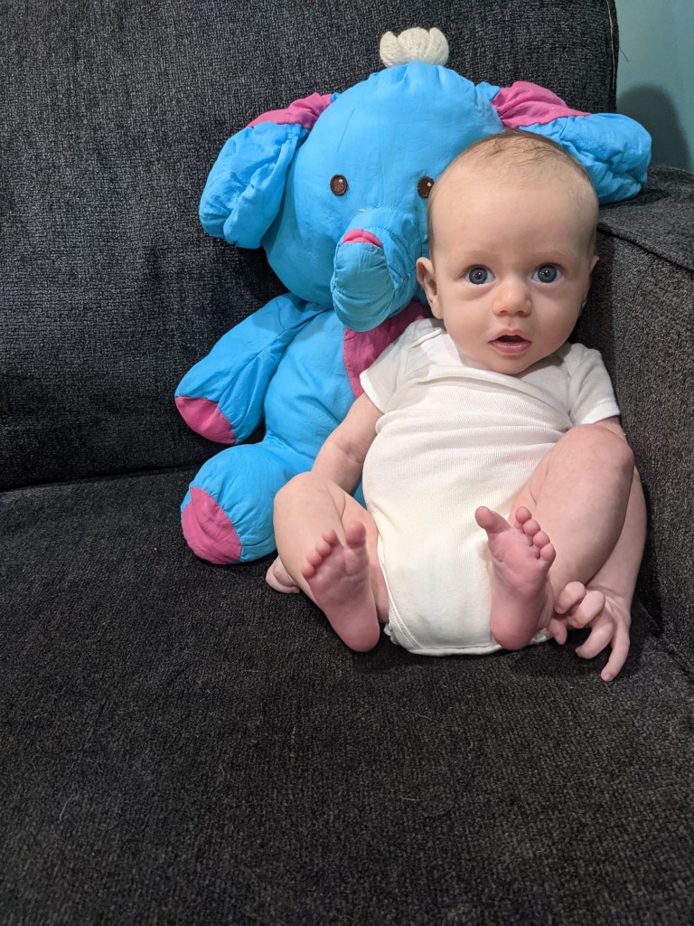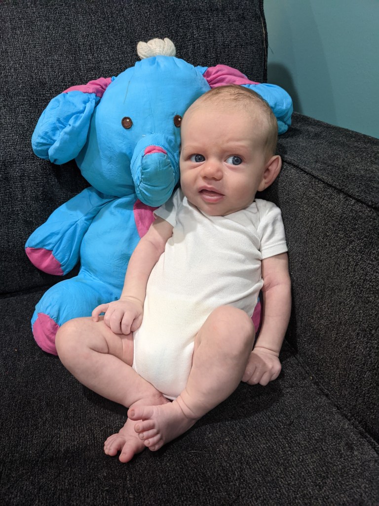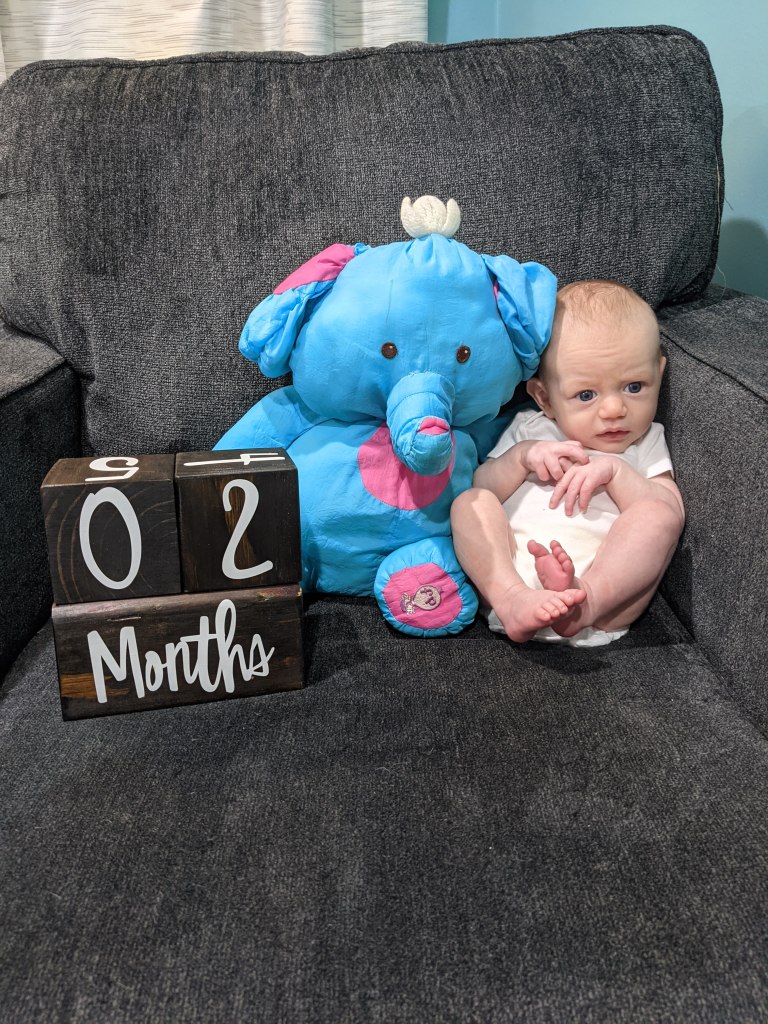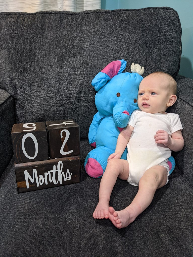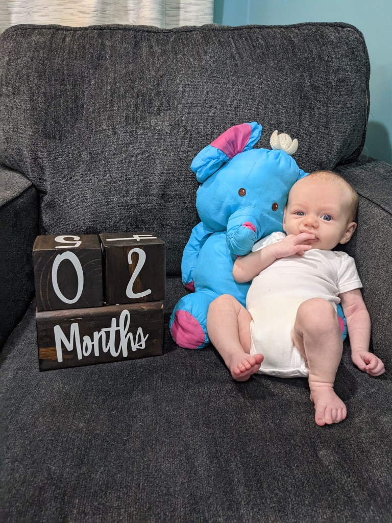 Diet: Each month feels like a major triumph with our breastfeeding journey. We are still feeding every 2-3 hours, but we backed off on the bottles in between. We occasionally will give him a one ounce bottle if he is having a fussy day. I started using a new app to track his feedings, and it says that I am feeding him on average 3.5 hours total a day. I am pumping 1-3 times a day to stock up for when I go back to work, and I have pumped just about 100 oz this month. My schedule is still pretty tight around his feeding, but the windows of time do seem to be getting bigger in length. I am no longer using the nipple shields which saves me so much time and hassle. It’s also a bonus that it’s no longer painful when he is feeding. I am in a much better place than I was last month with our breastfeeding plan, but as always my goal is to make it to the next month and re-evaluate. I head back to work here soon, so we’ll see how that affects the dynamic.