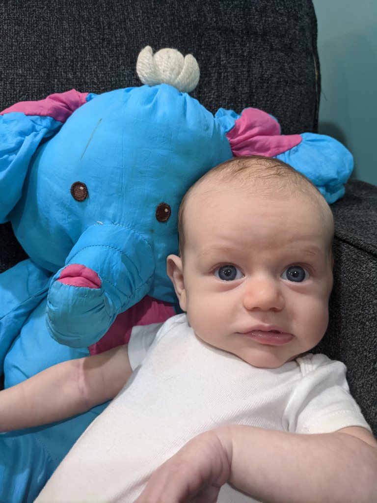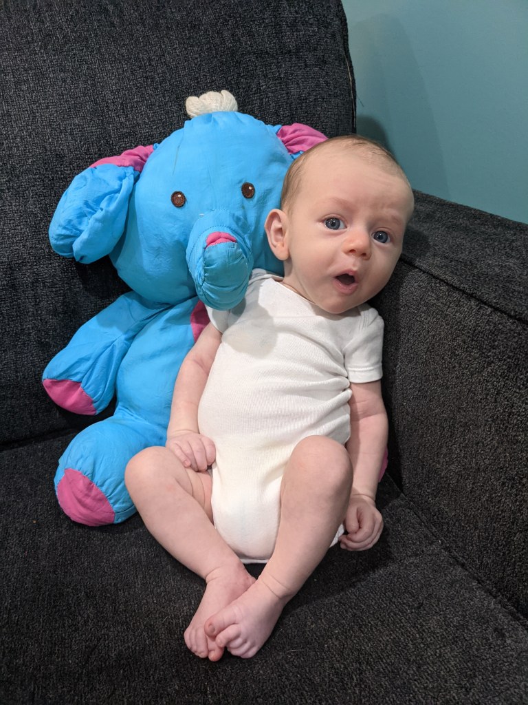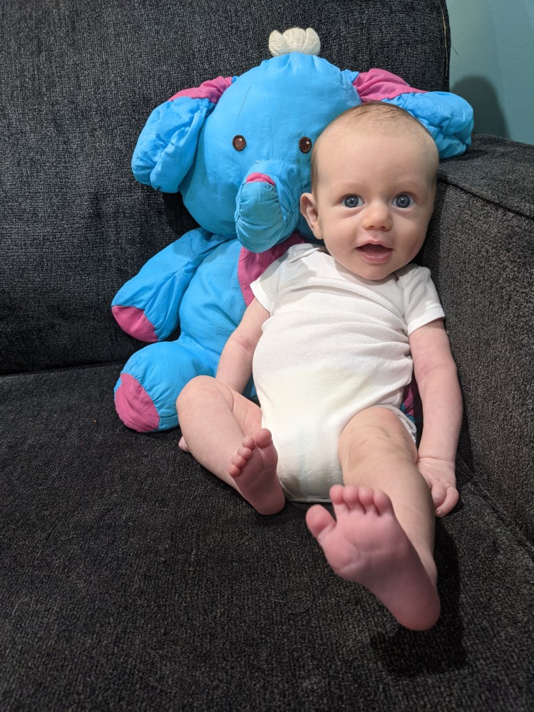 Milestones: He just started smiling over the last couple days. He is also doing a really good job with his neck control.