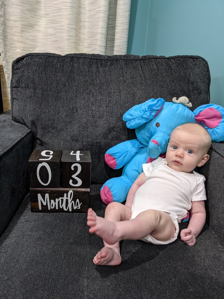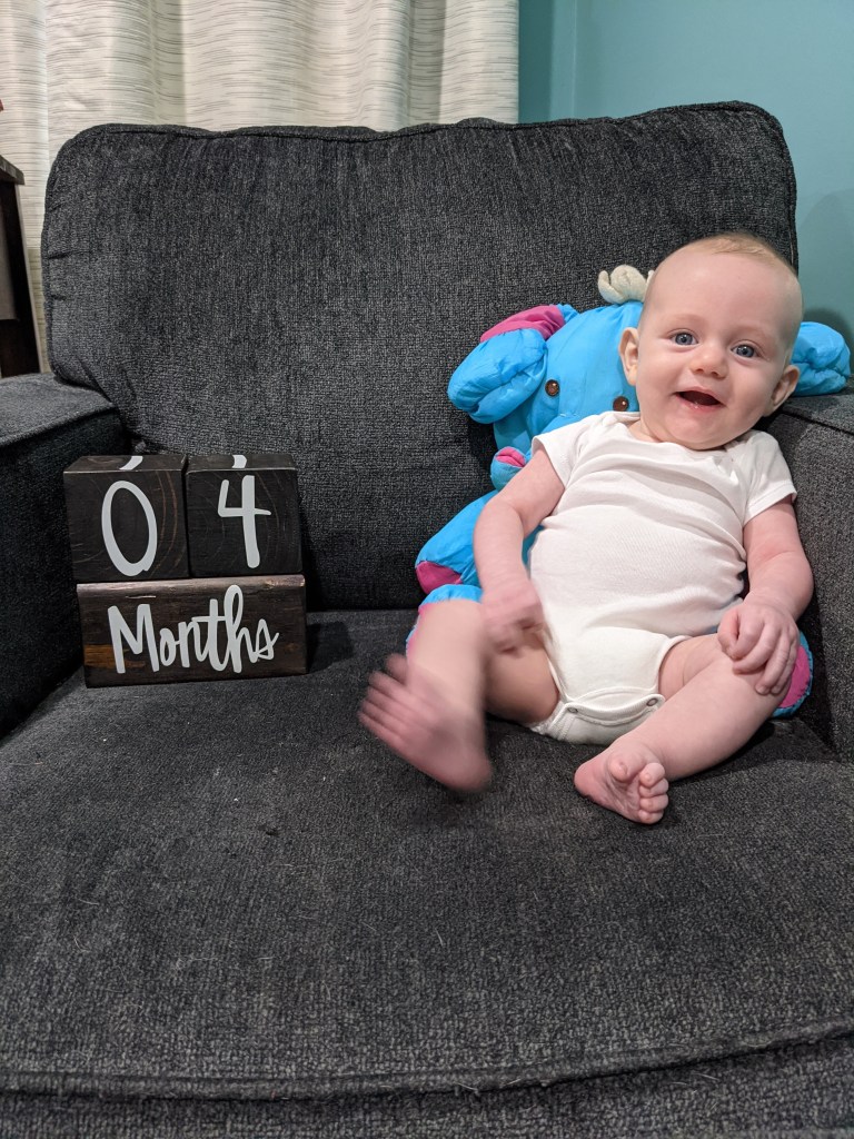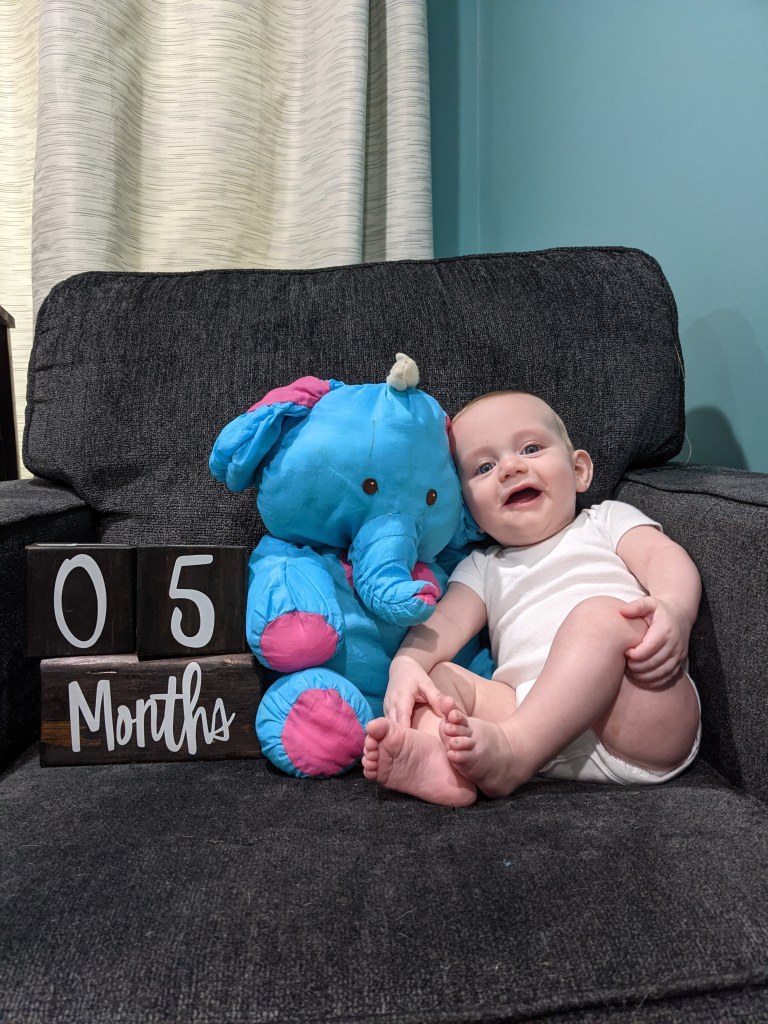 Diet: I have made it another full month of exclusively breastfeeding him! My supply is going down when I am pumping, so I am not sure if it also going down when I am at home. The last couple weeks have been extremely difficult for us in this arena. He is only wanting to feed for 5-10 minutes for each feeding, and a lot of that he spends crying or biting me. I have had to add additional feedings throughout the day, and he is often waking up in the middle of the night. I just am not sure what is happening as I didn’t have this occur with either other kid. They were both on formula at this point. I am worried that he isn’t getting enough. But he is growing so I guess there is that. He just seems easily distracted or impatient with me. Walt feeds 5-7 times a day, and on average it adds up to 2 hours of nursing. He was going around 4 hours between feedings during the day, and then this week is about every 2-3 hours. My app says that we have had 159 feedings over this last month, and spent 2 days nursing him. I have also pumped 17 times over the month. We continued with solids this month, but we haven’t been pushing it too much since he still doesn’t seem too interested. He does really like strawberries, peaches, and green beans. We added sweet potato fries, yogurt, and applesauce this month.