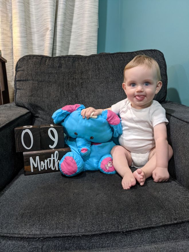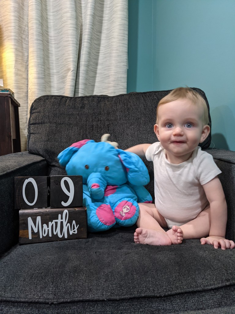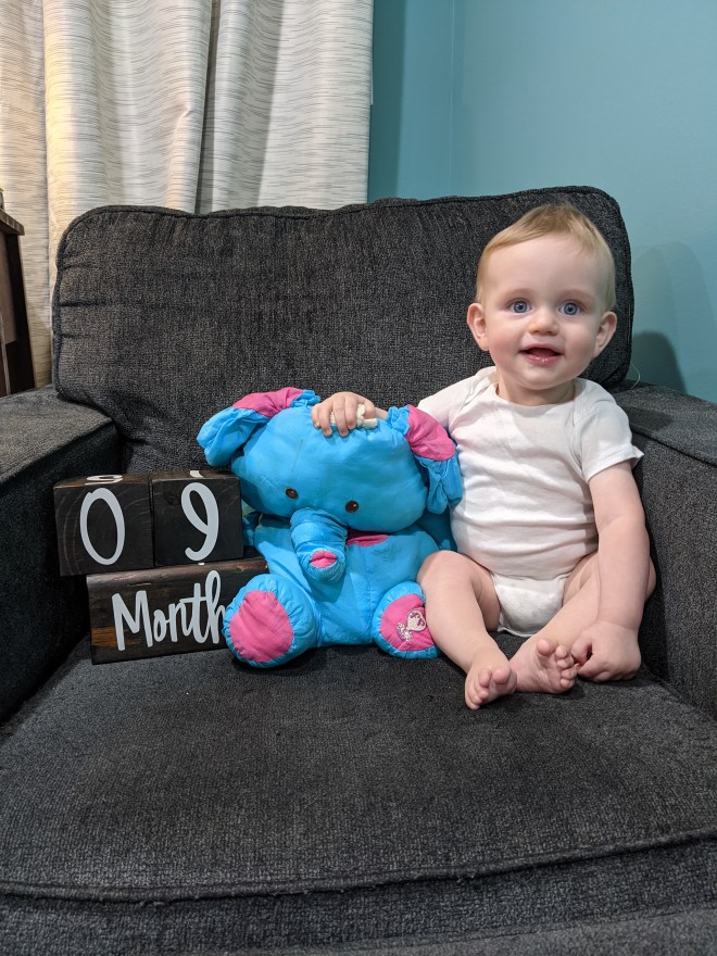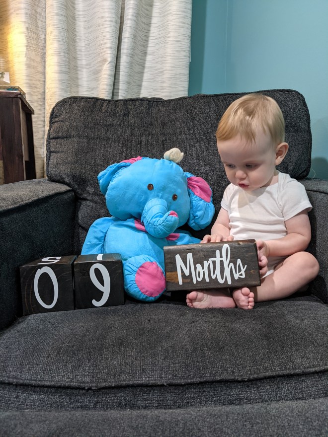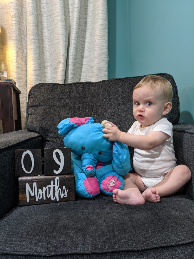 Diet: I have made it another full month of exclusively breastfeeding him! I honestly cannot believe that I have made it to NINE months! I really didn’t think we were going to make it all the way through this month. It has been a little tricky. He is only wanting to feed for 5 minutes max for each feeding, and a lot of that he spends crying or biting me. I have almost doubled the feedings throughout the day, and he is often waking up in the middle of the night. But we made it through another month. We will be adding formula for at least one feeding starting next week, as my freezer stash is completely out. Walt feeds 6-9 times a day, and on average it adds up to 1 hour of nursing. My app says that we have had 173 feedings over this last month, and spent a little over a day nursing him. I have also pumped 25 times over the month. We continued with solids this month, and he seems to be liking it a lot more. We added asparagus, crackers, rice, noodles, tilapia, salmon, hamburger, cauliflower, and peas this month.
