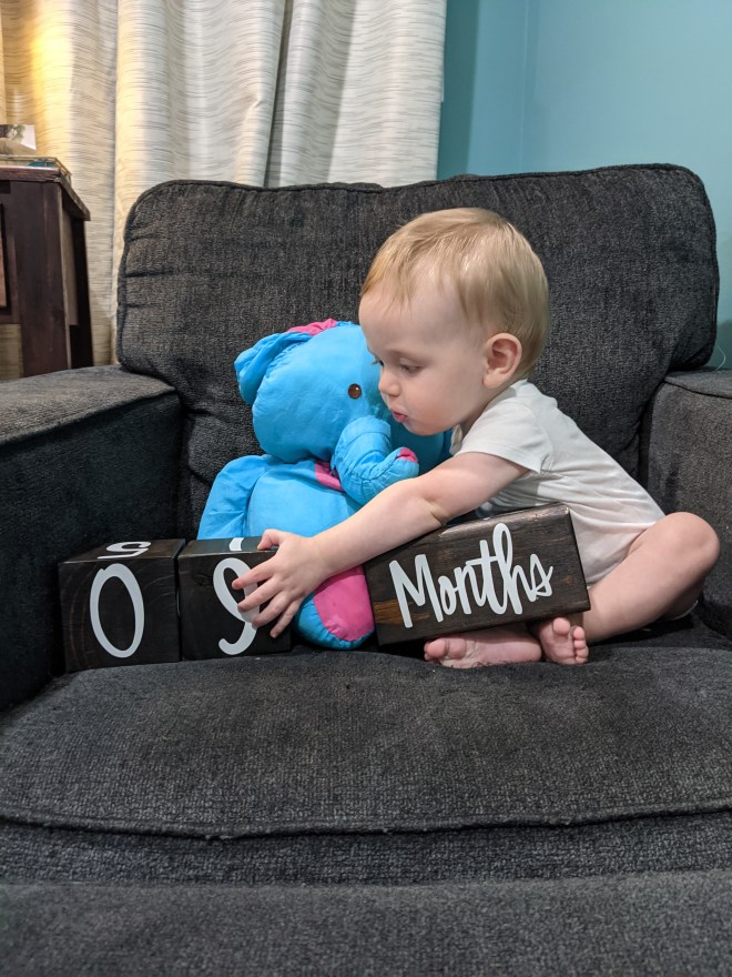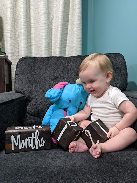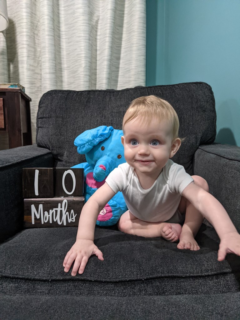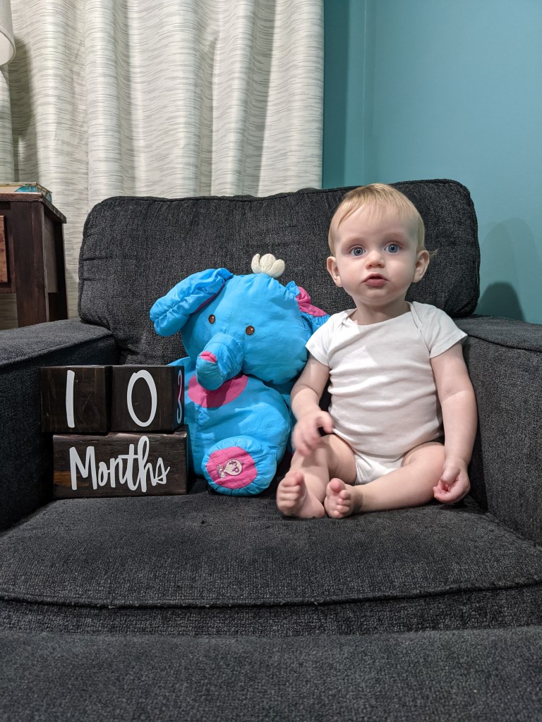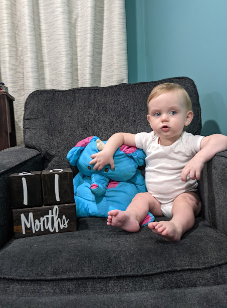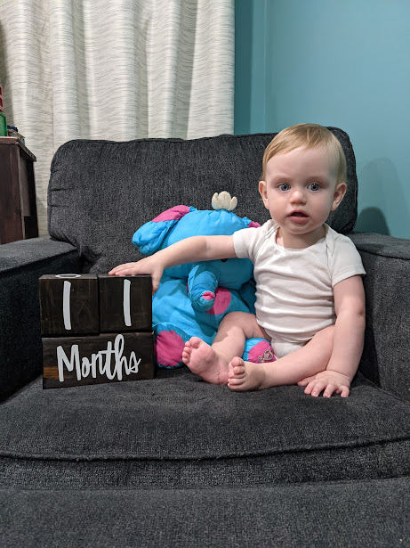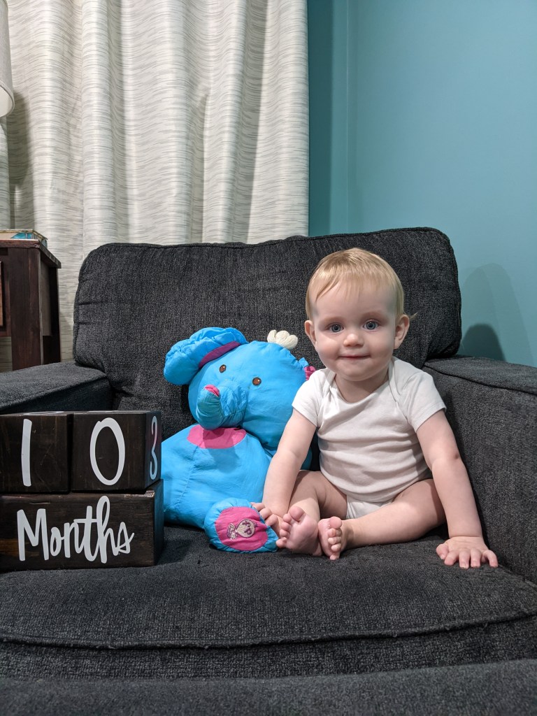 Diet: Here is where the stress lies. I had been increasing his feedings to almost every 2 hours since he was only spending at most 10 minutes feeding (2-5 mins a side). He was also waking up in the night to feed. Shortly after he turned 9 months, we did add a formula bottle to help with the night feedings, but he was still waking up 2 hours after that bottle. So when I explained this to our pediatrician, she was concerned that this was all signs that he was not getting the calories that he needed during the day. My mom brain heard that I was starving my kid through nursing. She said that she wanted to have us bottle feed him so that we could visually see what we are giving him and see if the sleeping patterns changed. I refuse to exclusively pump though. The pump and I do not do well, and my mental state dramatically declines the more I have to depend on it to make this work. So we are going to move ahead and still nurse every 4ish hours, but follow it shortly after with a 4-6 oz formula bottle. After a week, it seems to be helping as we have only had a couple nights where he has woken up. As for nursing, Walt feeds about 5 times a day, and on average it adds up to 1 hour of nursing. My app says that we have had 147 feedings over this last month, and spent around 24 hours nursing him. I have also pumped 32 times over the month. I do know that I have nothing to feel guilty about with all of this We are feeding him 3 “meals” a day, and he is really getting the hang of real food. We added a squash, salmon patties, blueberries, watermelon, turkey, hamburger, shredded cheese, meatballs, and meatloaf this month. His favorites are peas, meatballs, and blueberries.