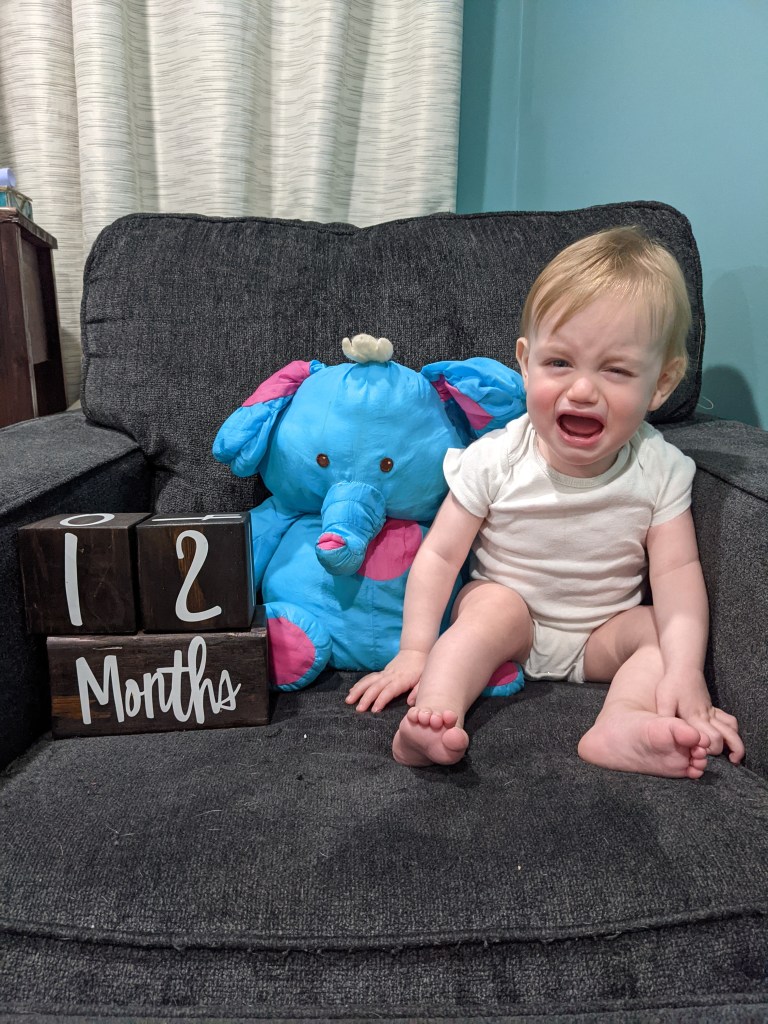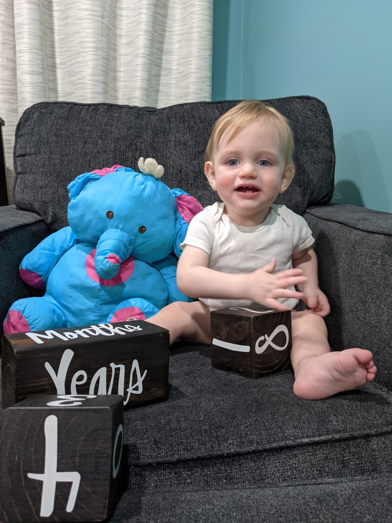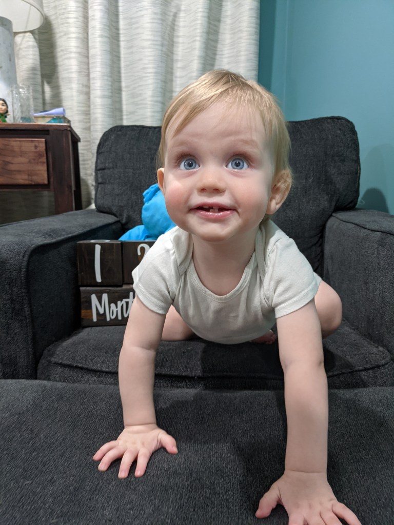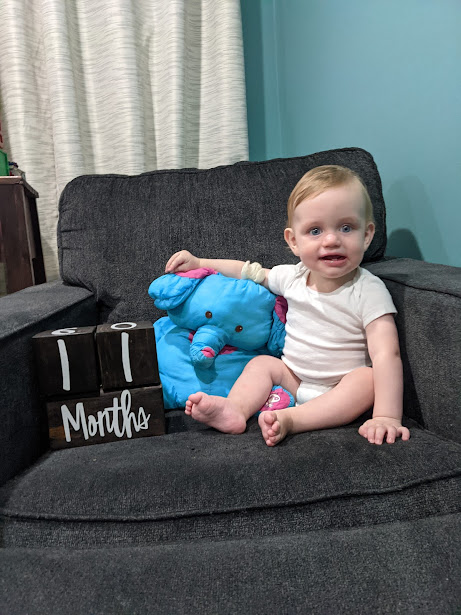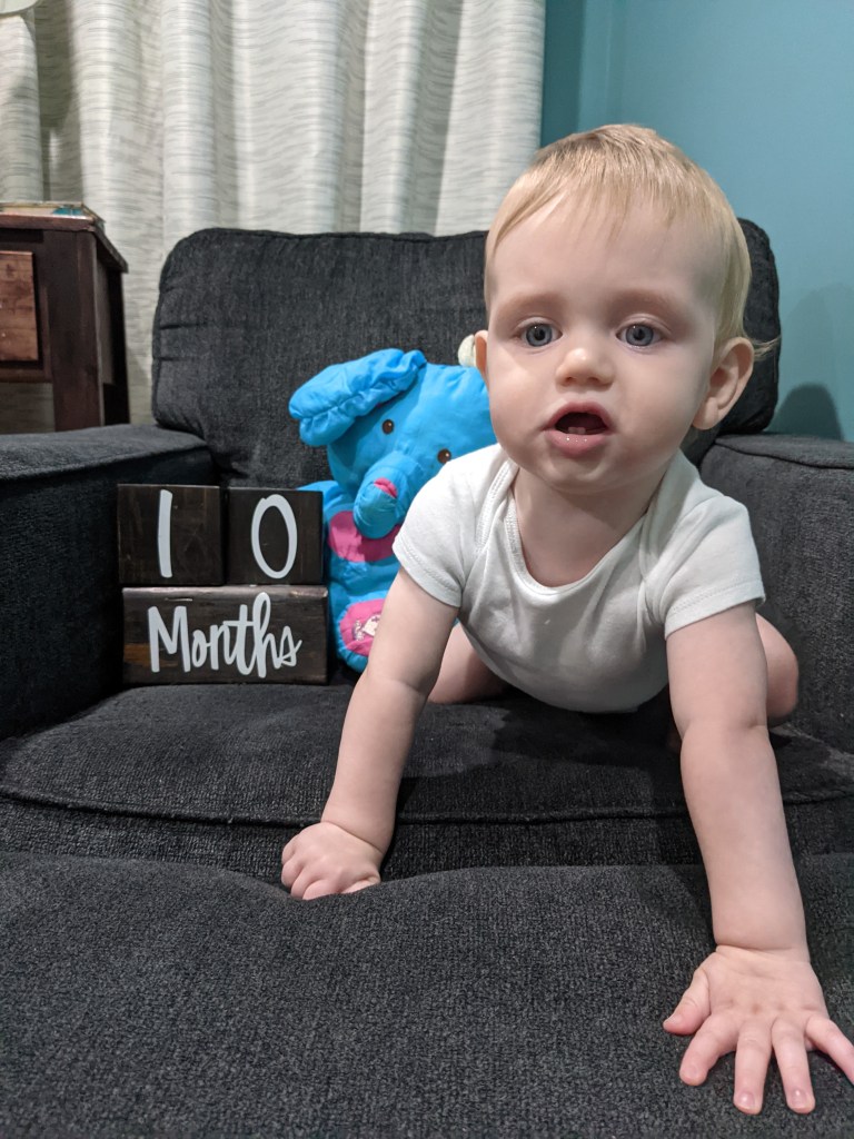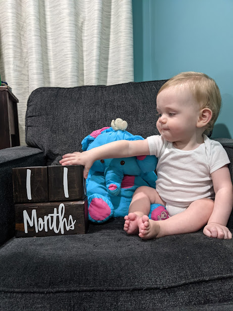 Diet: Here is where the stress lies. I had been increasing his feedings to almost every 2 hours since he was only spending at most 10 minutes feeding (2-5 mins a side). He was also waking up in the night to feed. Shortly after he turned 9 months, we did add a formula bottle to help with the night feedings, but he was still waking up 2 hours after that bottle. So when I explained this to our pediatrician, she was concerned that this was all signs that he was not getting the calories that he needed during the day. My mom brain heard that I was starving my kid through nursing. She said that she wanted to have us bottle feed him so that we could visually see what we are giving him and see if the sleeping patterns changed. I refuse to exclusively pump though. The pump and I do not do well, and my mental state dramatically declines the more I have to depend on it to make this work. So we are going to move ahead and still nurse every 4ish hours, but follow it shortly after with a 4-6 oz formula bottle. After a week, it seems to be helping as we have only had a couple nights where he has woken up. As for nursing, Walt feeds about 5 times a day, and on average it adds up to 1 hour of nursing. My app says that we have had 147 feedings over this last month, and spent around 24 hours nursing him. I have also pumped 32 times over the month. I do know that I have nothing to feel guilty about with all of this We are feeding him 3 “meals” a day, and he is really getting the hang of real food. We added a squash, salmon patties, blueberries, watermelon, turkey, hamburger, shredded cheese, meatballs, and meatloaf this month. His favorites are peas, meatballs, and blueberries.