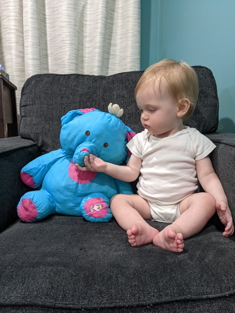Likes:  He loves the “That’s Not My” book series, and he squeals touching the sensory pages. He has these little egg musical shakers that he loves. He loves his lotion bottle. He has to hold it when I change his diapers otherwise a wrestling match ensues. Honestly, he loves to put anything in his mouth so everything becomes a toy to him. He loves his walker, and just zips around the living room and kitchen in it. He likes getting his teeth brushed. He enjoys any type of music, no dancing yet but he does love listening to it.