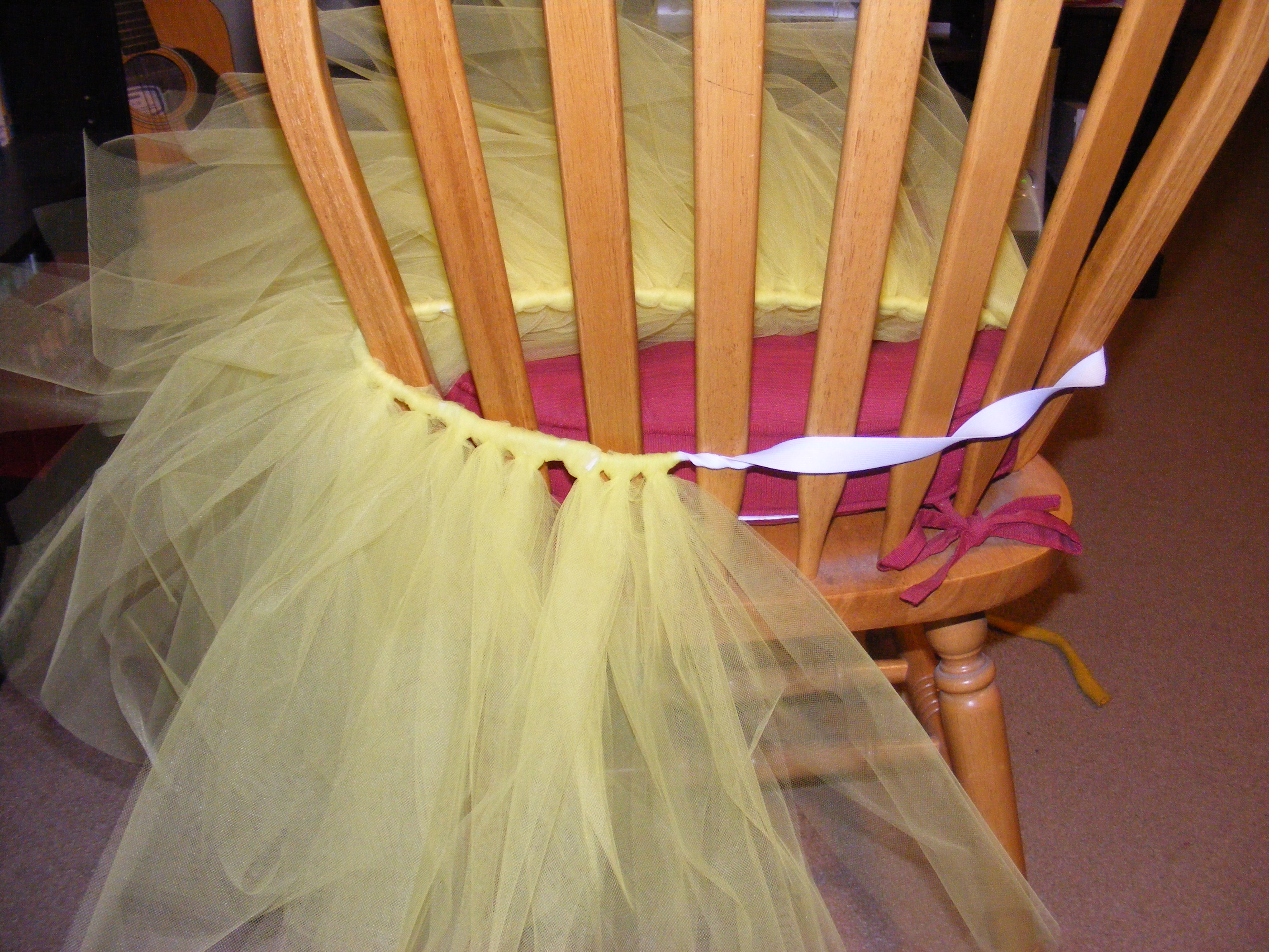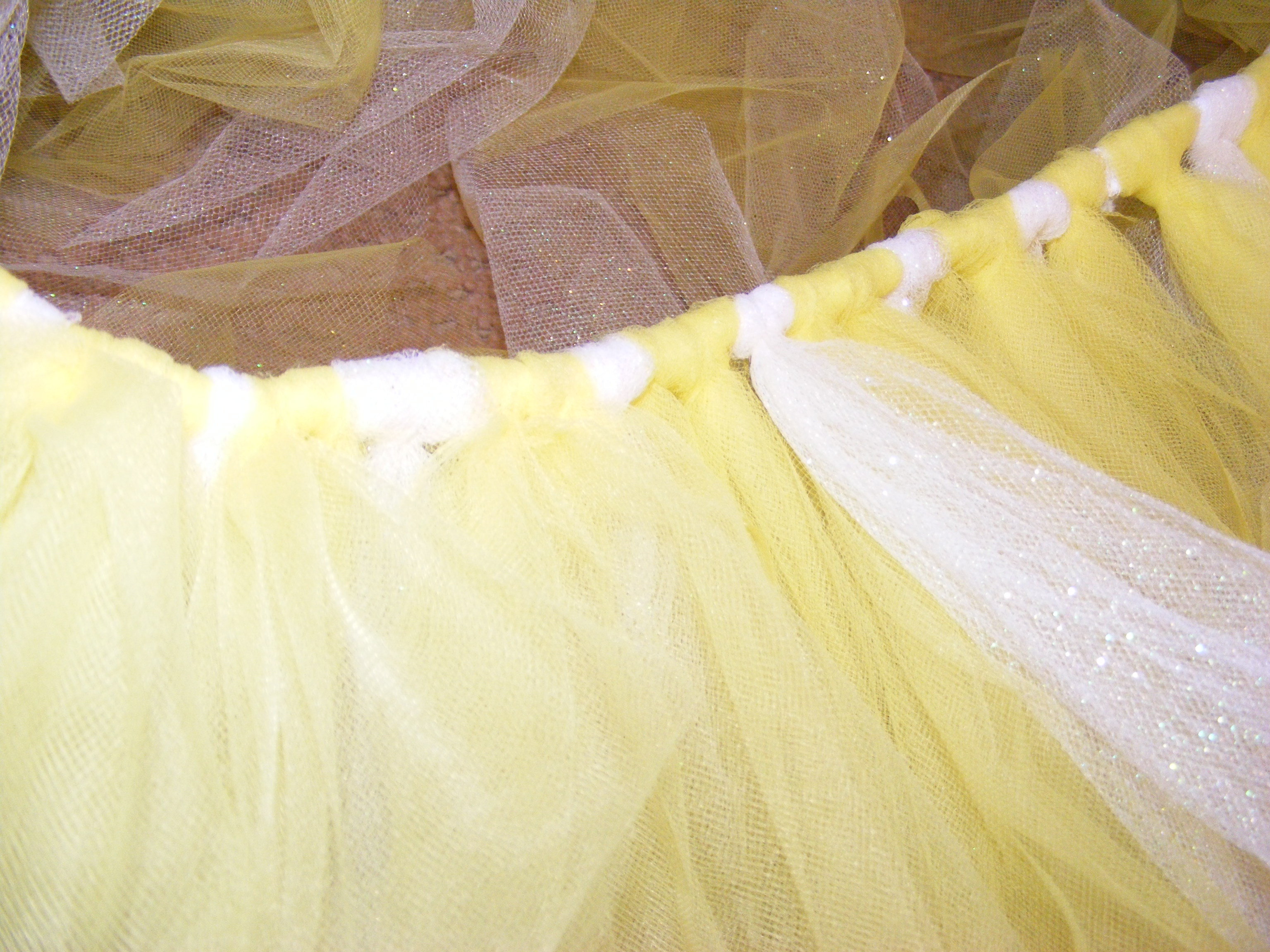 For the tutu I used 6 spools of tulle (4 yellow and 2 glitter) and an elastic band.
