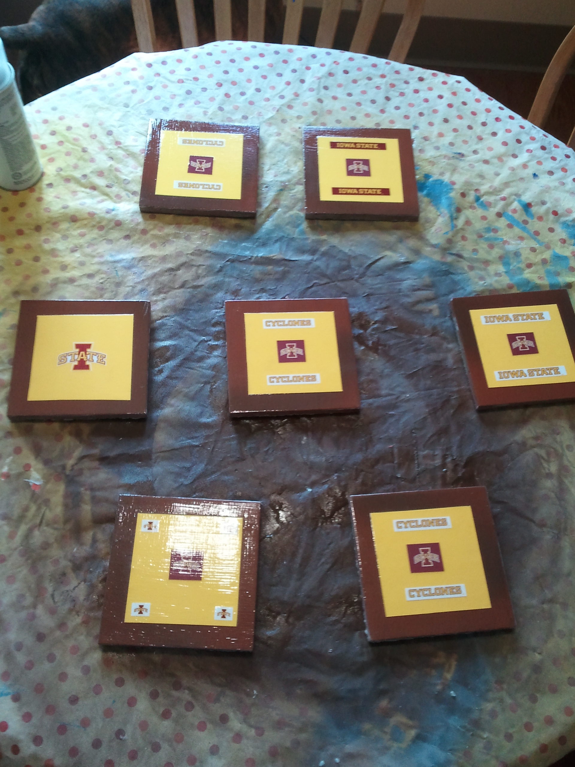 First I cut out the yellow cardstock to fit the tiles. Then I created a design for each one with the ISU scrapbook paper and stickers.