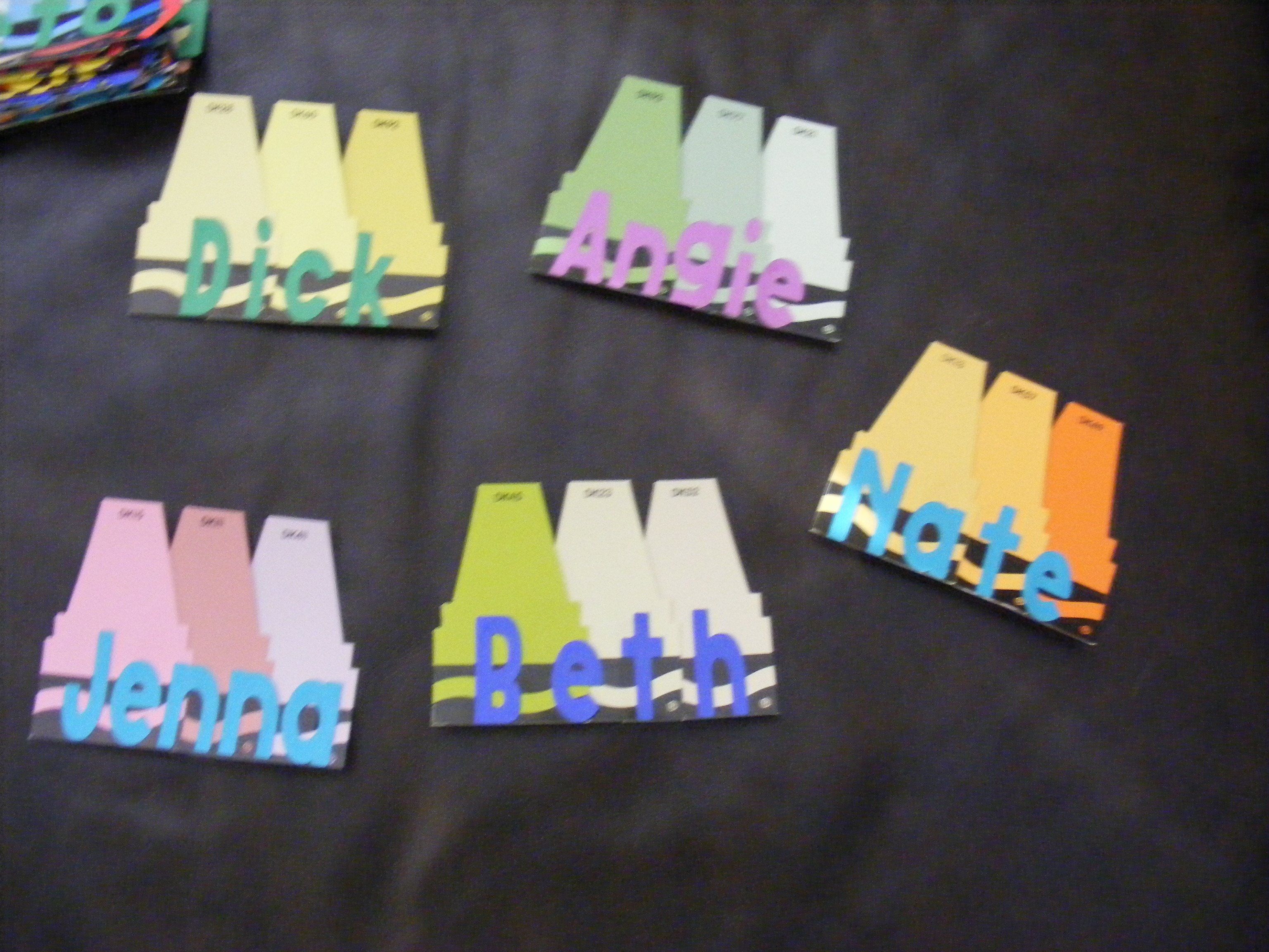 I used Crayola paint chips and plain cardstock for the door decs. And the BB has all of our baby pictures with short tidbits of ourselves for residents to guess who is who.